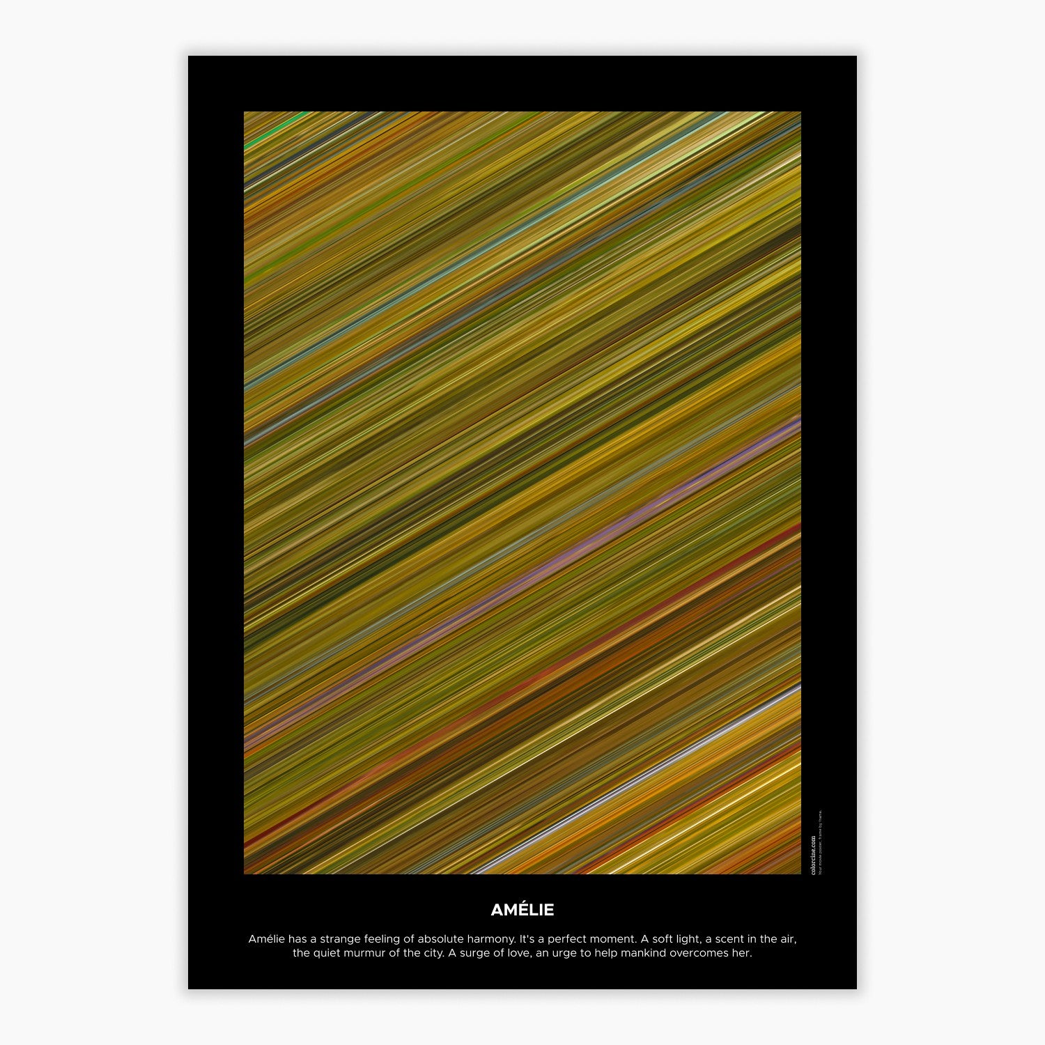Decorate your wall with this beautiful poster. Each line represents a frame of the movie or TV series episode. It's a colorful and memorable way to immortalize your favorite films or TV series.