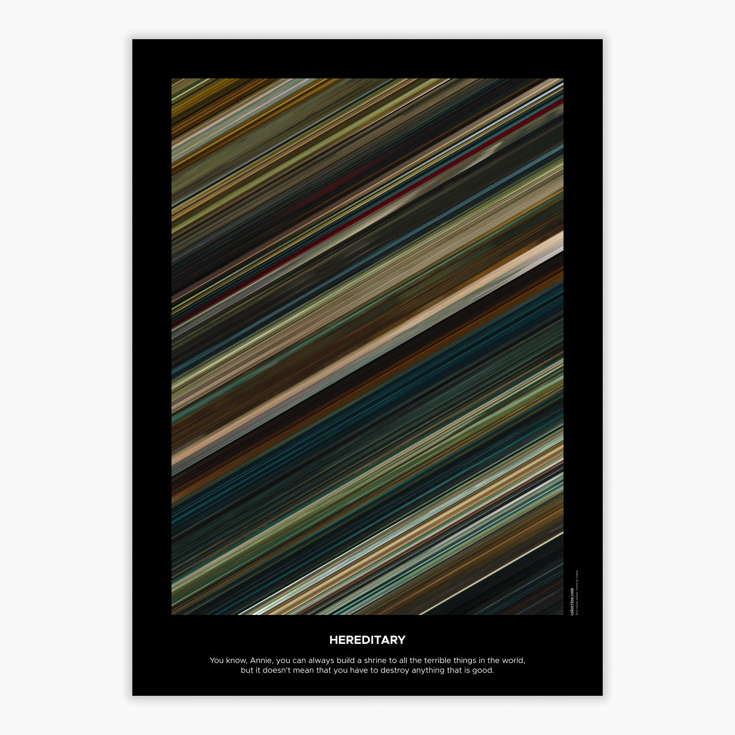 Decorate your wall with this beautiful poster. Each line represents a frame of the movie or TV series episode. It's a colorful and memorable way to immortalize your favorite films or TV series.