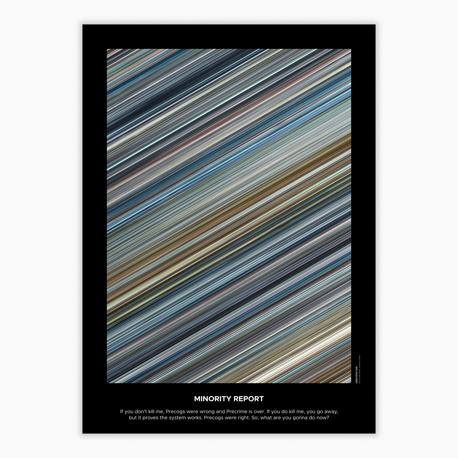 Decorate your wall with this beautiful poster. Each line represents a frame of the movie or TV series episode. It's a colorful and memorable way to immortalize your favorite films or TV series.