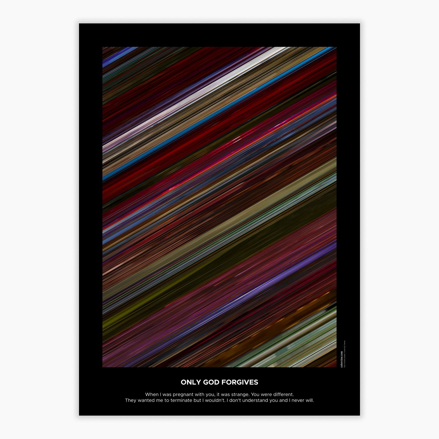 Decorate your wall with this beautiful poster. Each line represents a frame of the movie or TV series episode. It's a colorful and memorable way to immortalize your favorite films or TV series.