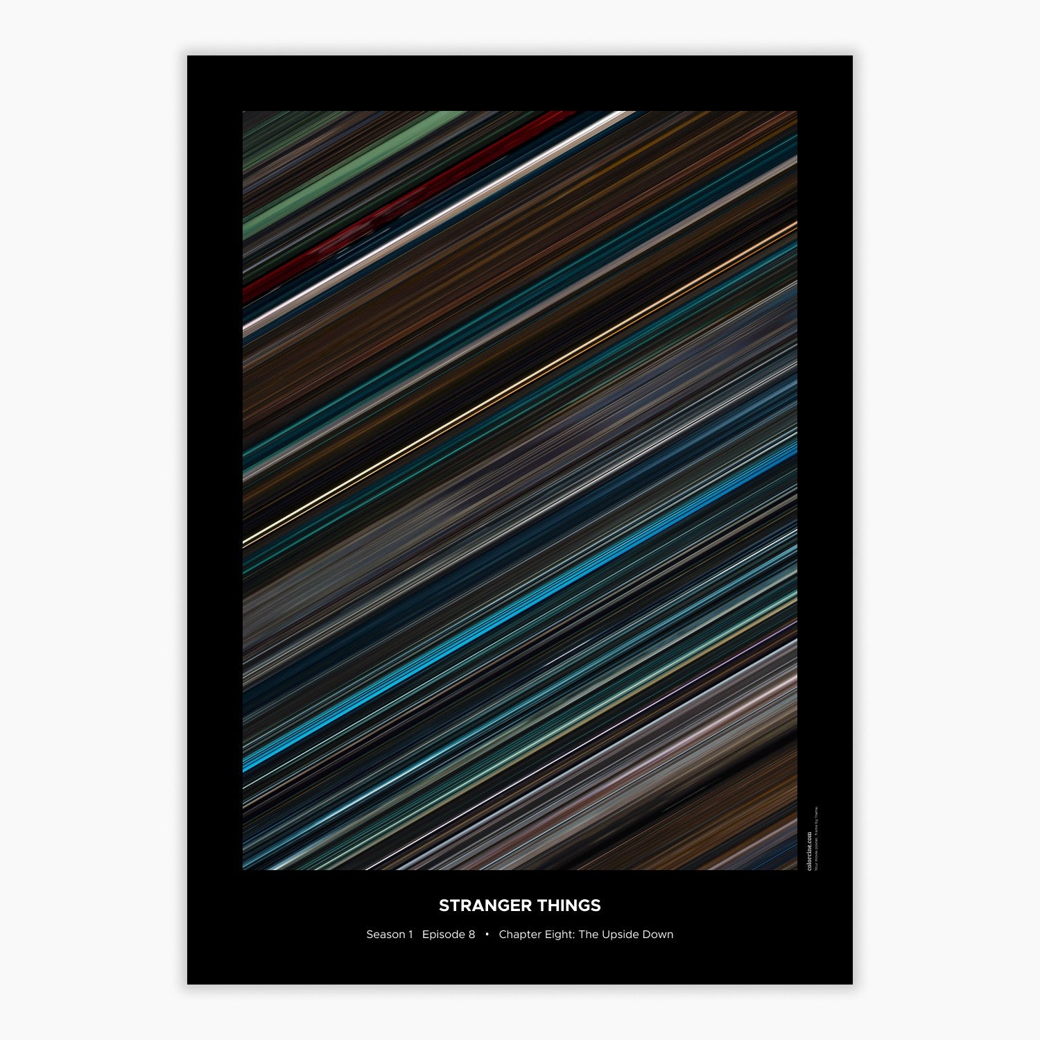 Decorate your wall with this beautiful poster. Each line represents a frame of the movie or TV series episode. It's a colorful and memorable way to immortalize your favorite films or TV series.